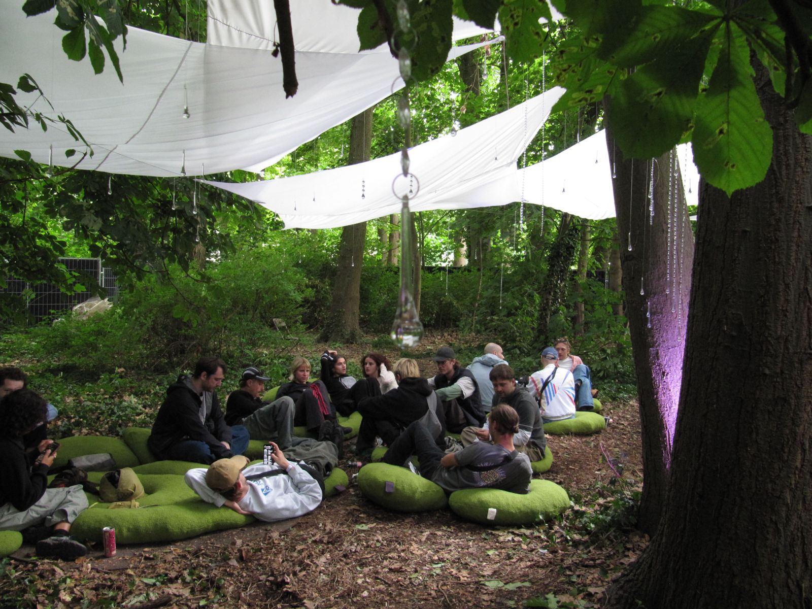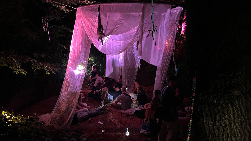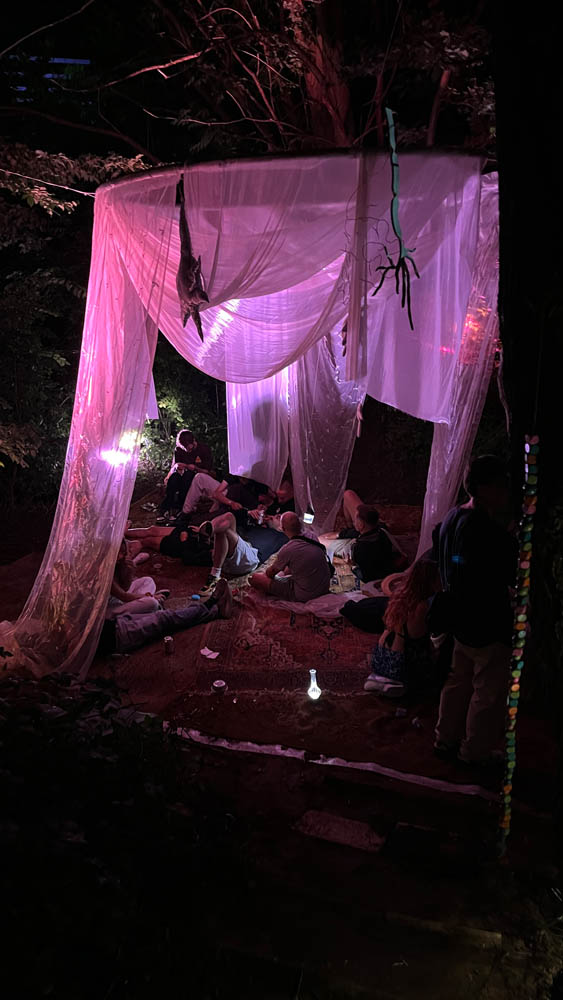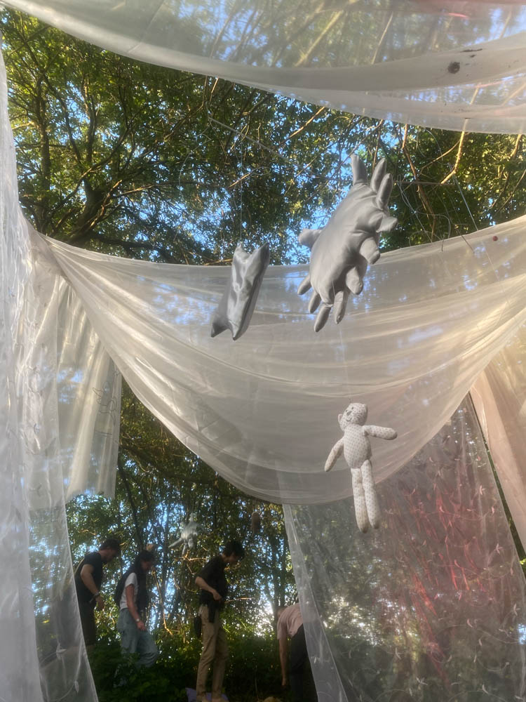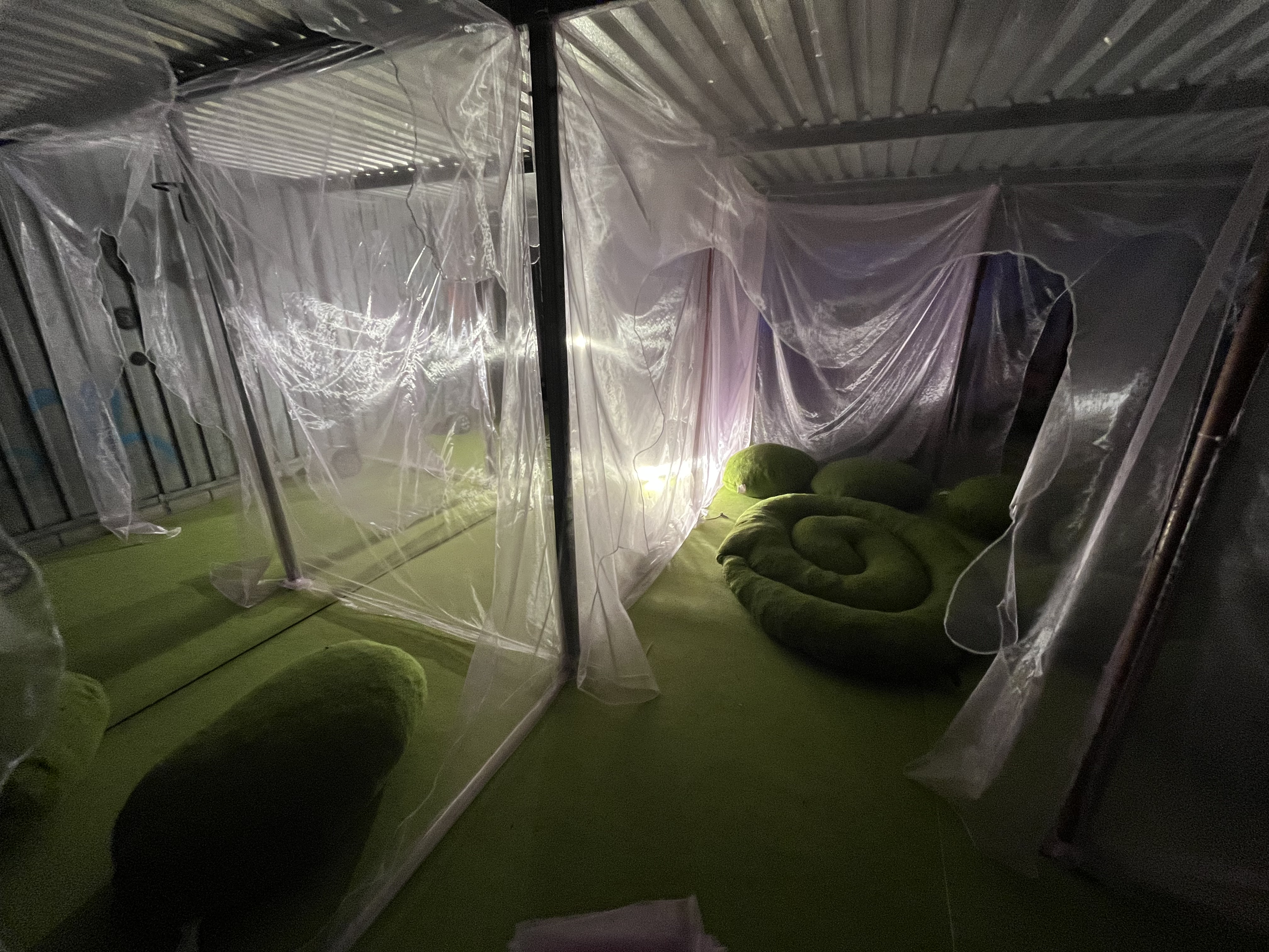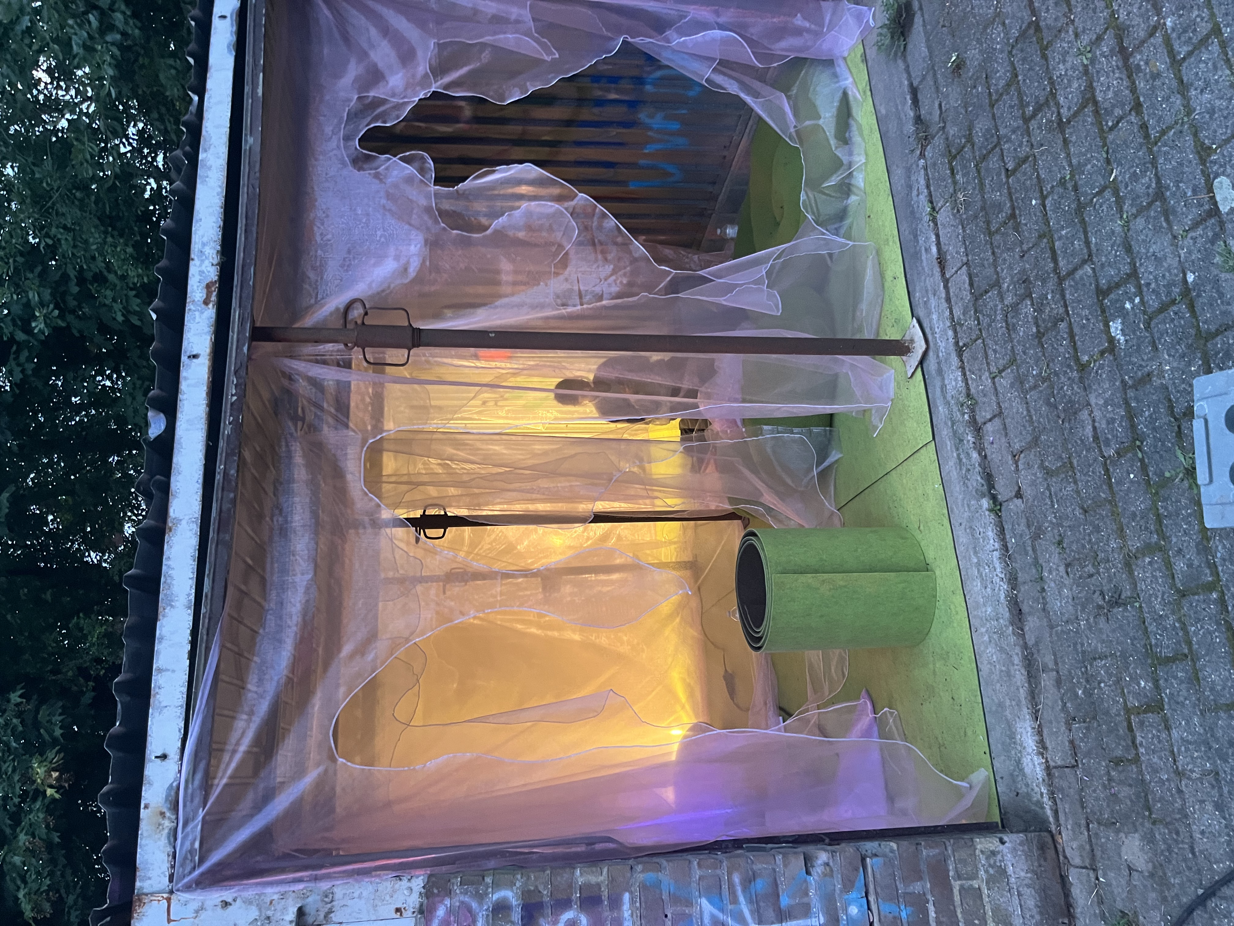 Together with Lea Ware and Laure Robenek I created this 'chill space' at Affair Open Air in August 2024. We wanted the space to be a safe haven for people to lay down, talk or chill next to the party. The main concept was that of a 'cribbe' (a babies crib), a space to let your inner child flourish, leaving all of your 'adult' conventions, ideas, shame... etc. behind. We also asked poetry artist Helena G. (@kid_on_fuzz) to write a poem as an introduction to the space, a moment for reflection before entering. The Cribbe was locatede in a pit, hidden in the forest next to the party, consisting of 2 levels with a long entry-way that was filled with 'childish' decorations and mobiles, made with second hand children's toys and other reused objects.