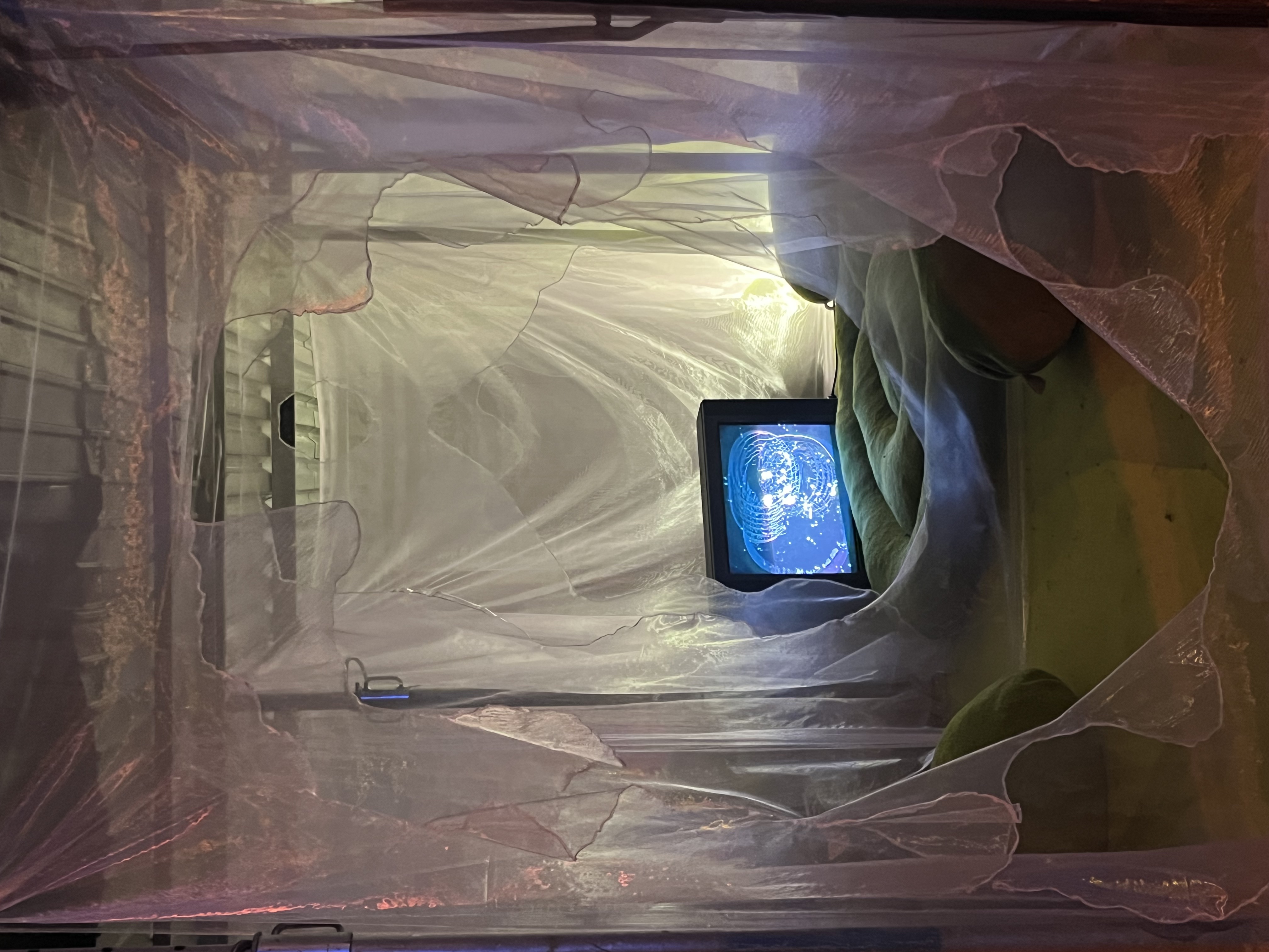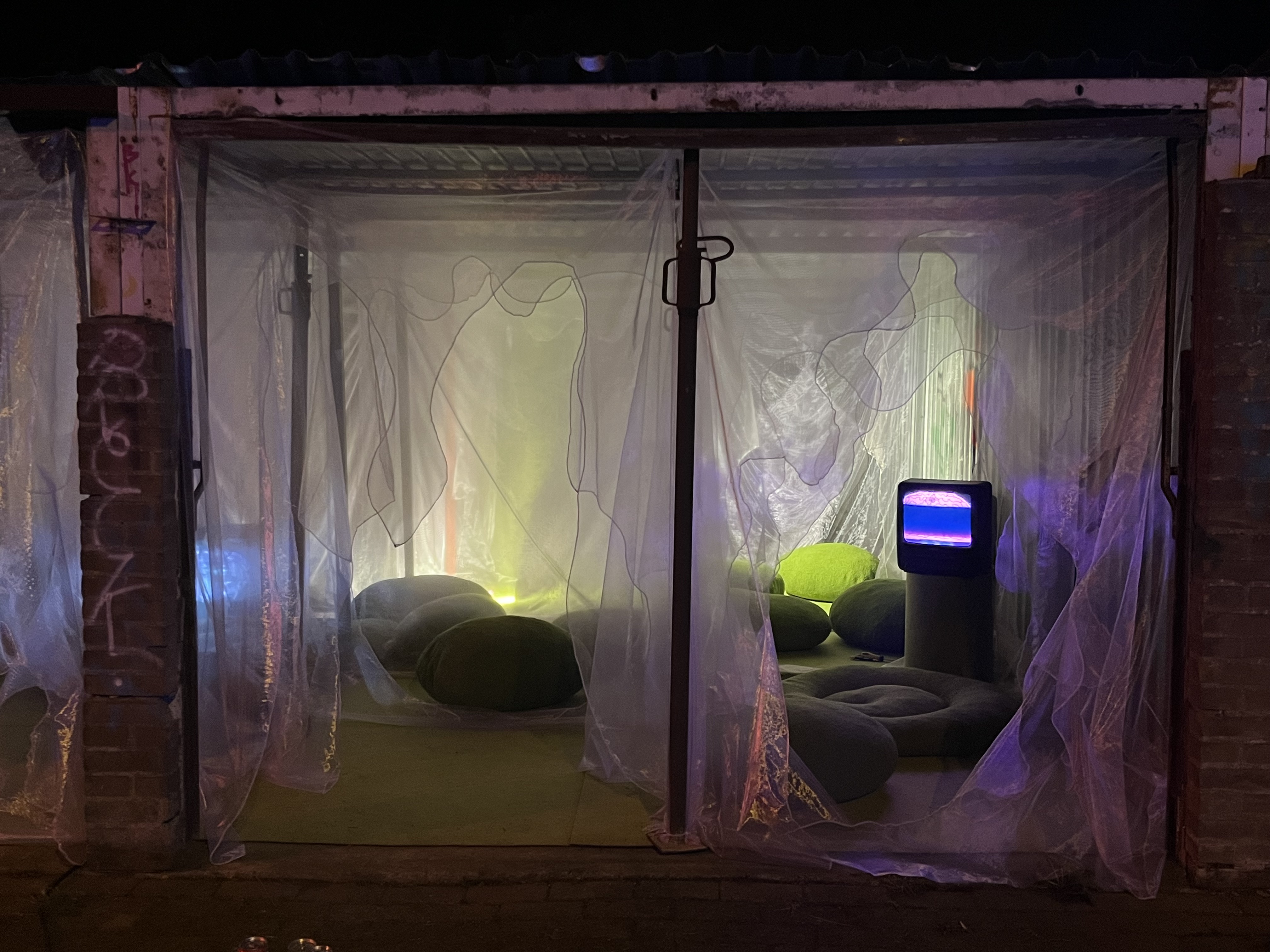Textile and Video installation for Doel Festival 2025, together with Eline Dewit. A fabric maze built inside of a an old garagebox in the ghost village of Doel.