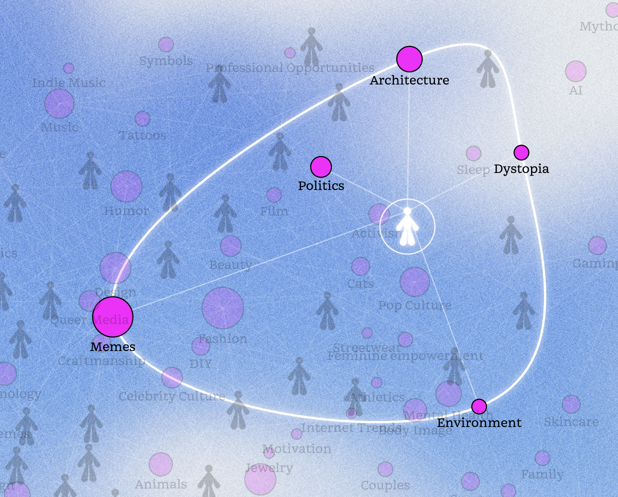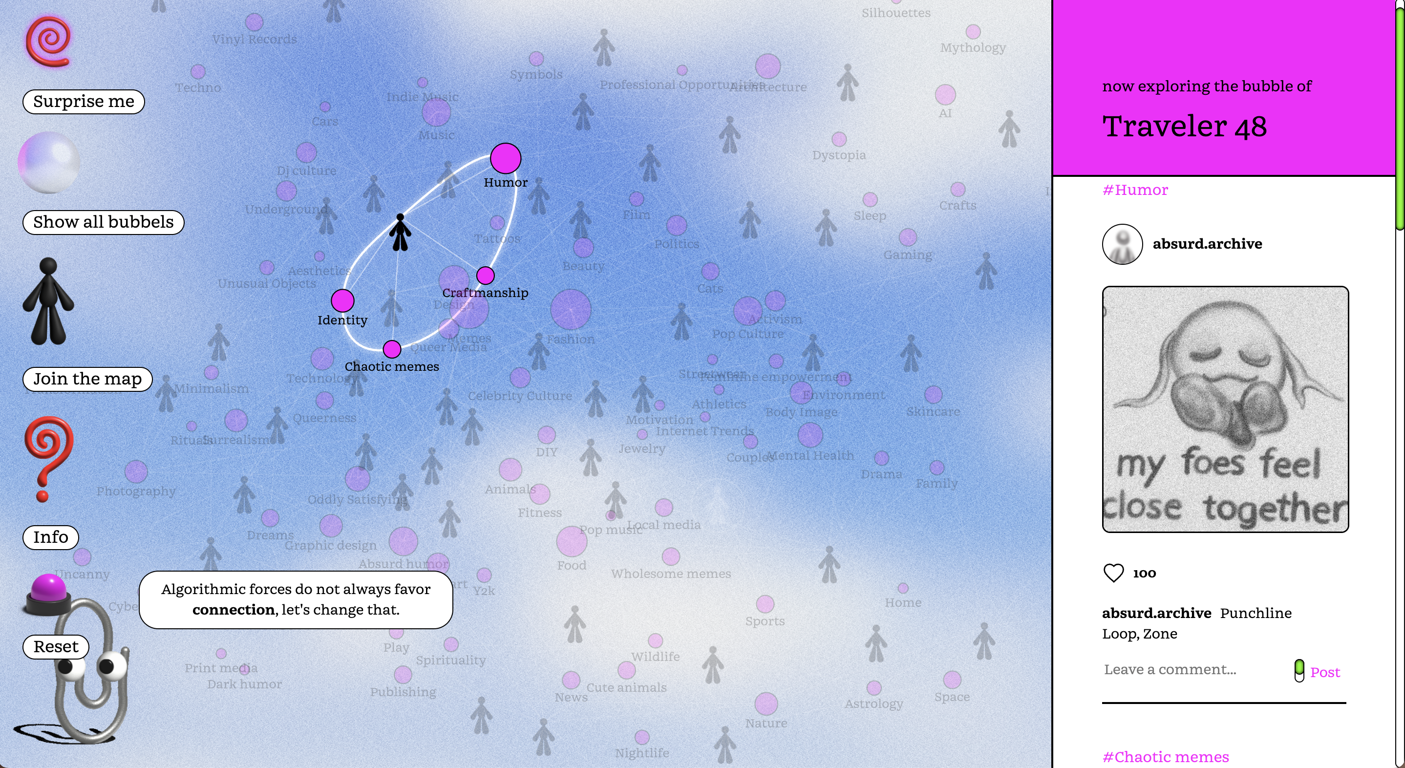 This interactive network visualisation is a part of my Master's Thesis, exploring how algorithmic systems and typical social-media interfaces shape our digital experiences. The map seeks to challenge the passive, linear, and filtered 'feed' by reimagining social media as a collective, interconnected network. A map that zooms out from our filter bubbles and revalues the early ideals of the internet: decentralised access, connection, exploration, surprise, and a fertile ground for digital serendipity. Algorithmic forces do not favour connection, let's change that. (best to visit on desktop)