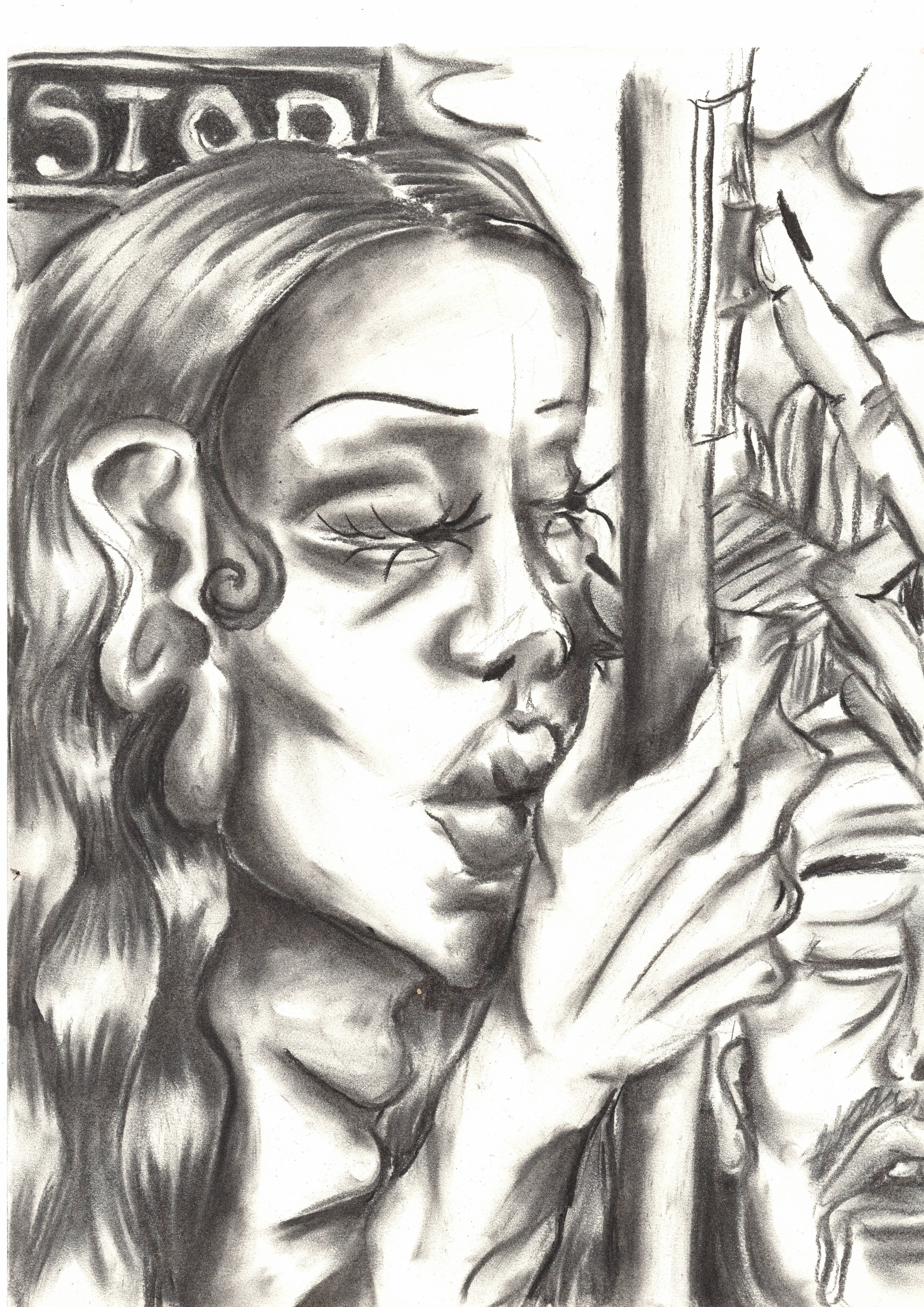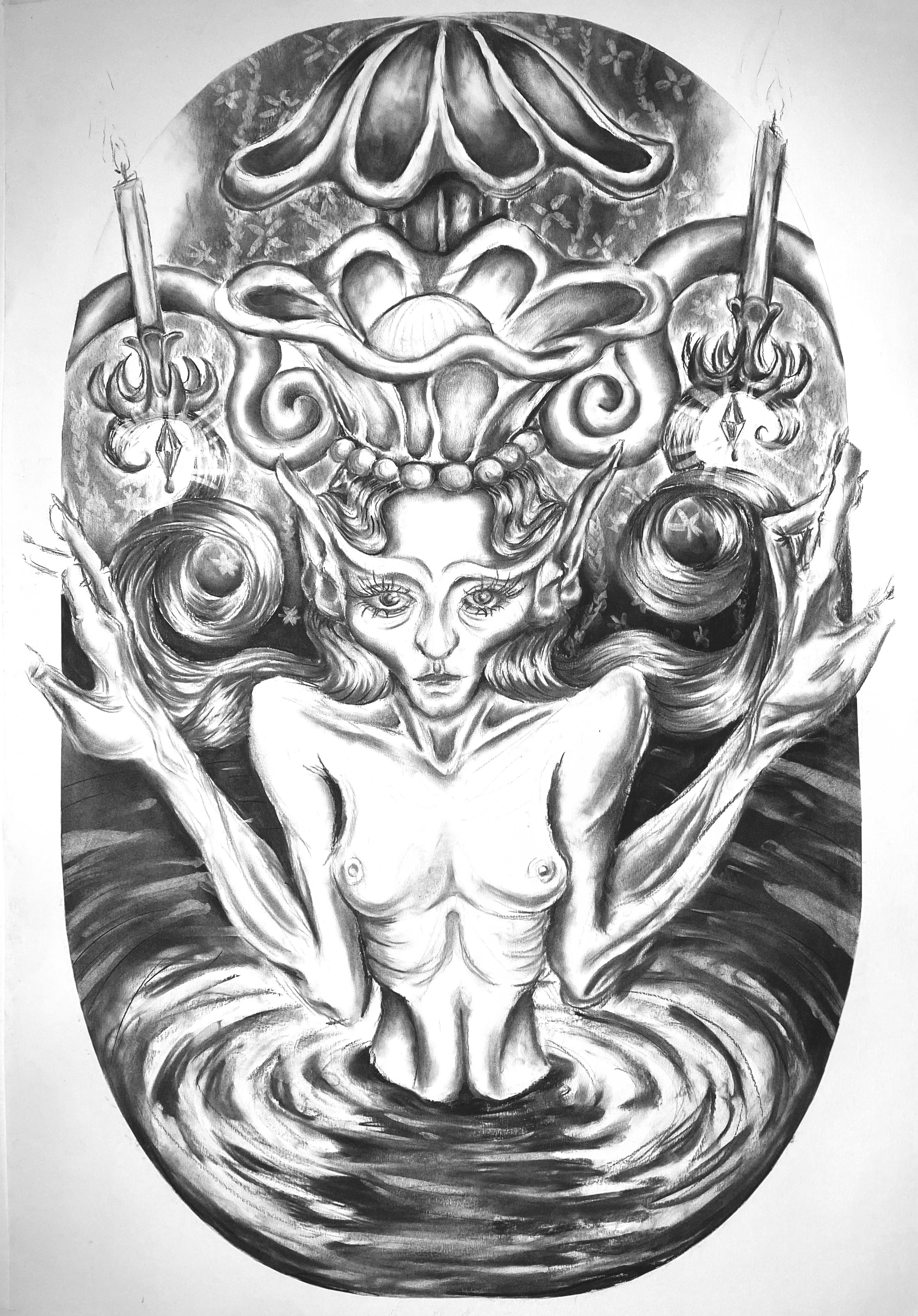 This series of drawings represents a character study for a fictional Goddess, my ‘Idol' Goddess. A character study of my marionette, where I discovered a strong interest in objects or structures that share similar qualities with the body I keep drawing. This woman is depicted as a sort of idol. She naturally had something frightening and spiritual about her. For me, she now represents a mythical being, a princess from another world. 'Idol' is a series of charcoal drawings on white paper, ranging from A3 to A0 size (the first two).