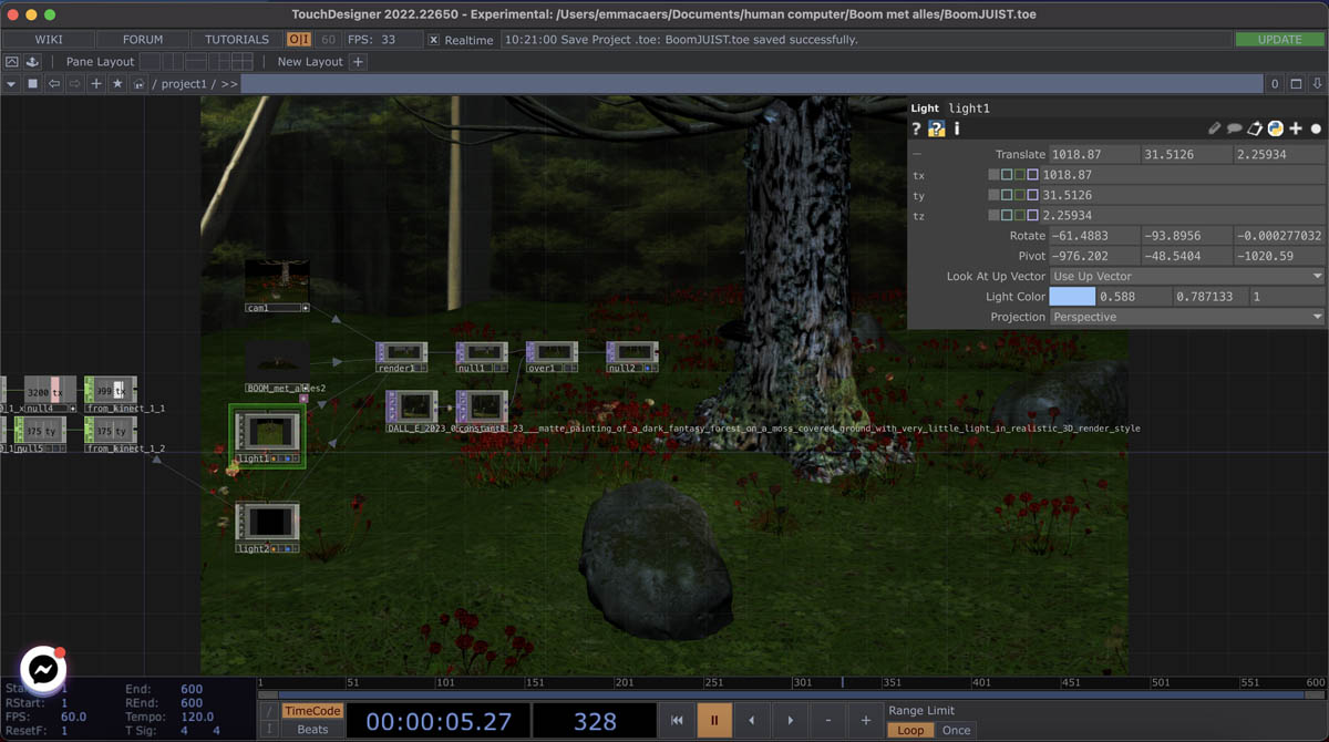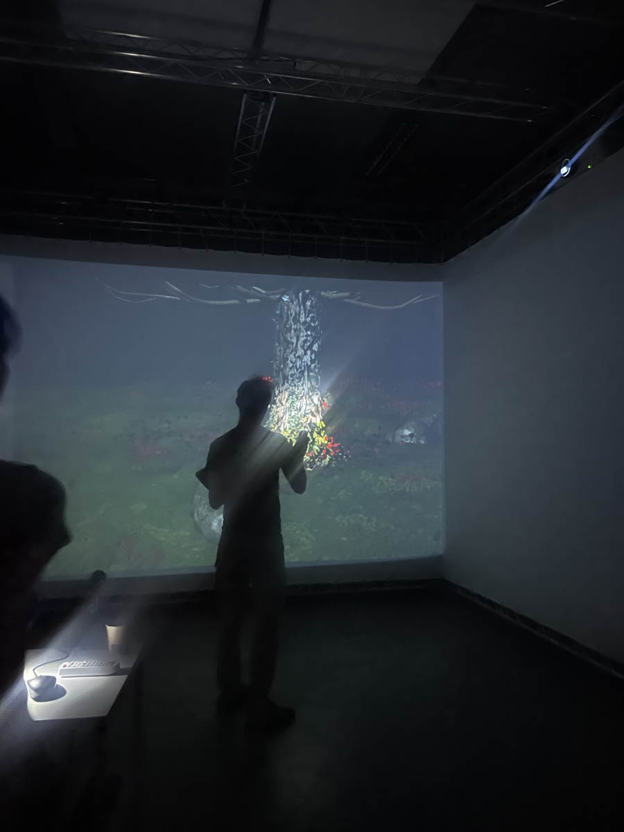 The 'Silsom Boom' is part of a study exploring how a viewer can interact with a digital, three-dimensional environment. It is an interactive installation that uses a Kinect Azure to track the X, Y, and Z position of a hand and, based on that position, projects a flashlight in a virtual forest within the virtual space. The intention is to minimize barriers between the individual and the environment, creating an aesthetic experience where the user feels connected to a fictional, digital fairy forest, allowing them to explore it themselves. The digital forest is a collage of 3D scans from the Silsombos in Erps-Kwerps and existing scans from libraries on the internet.