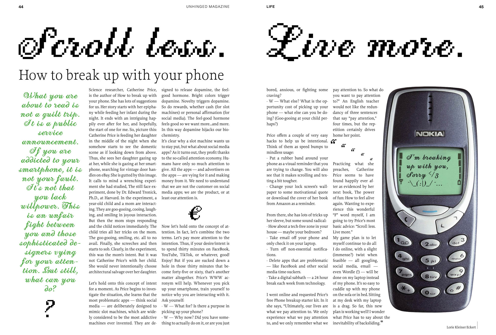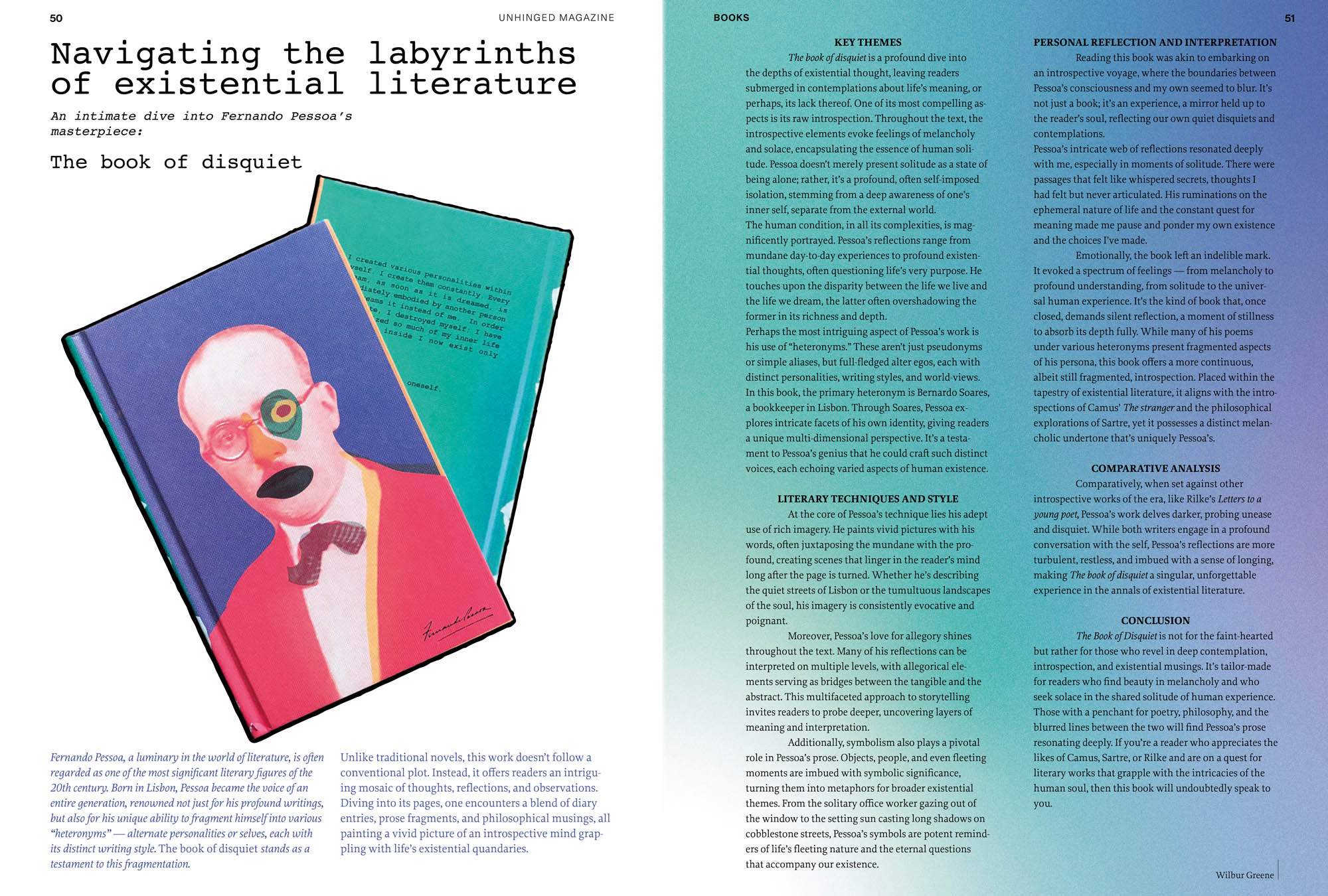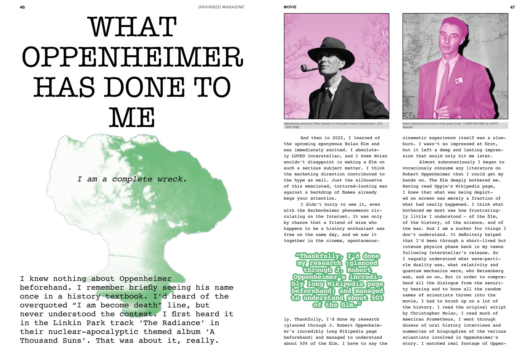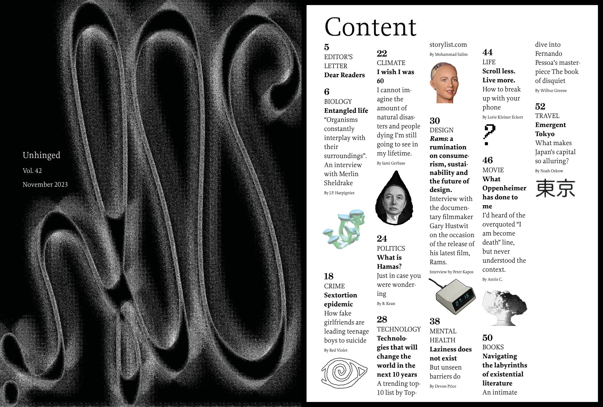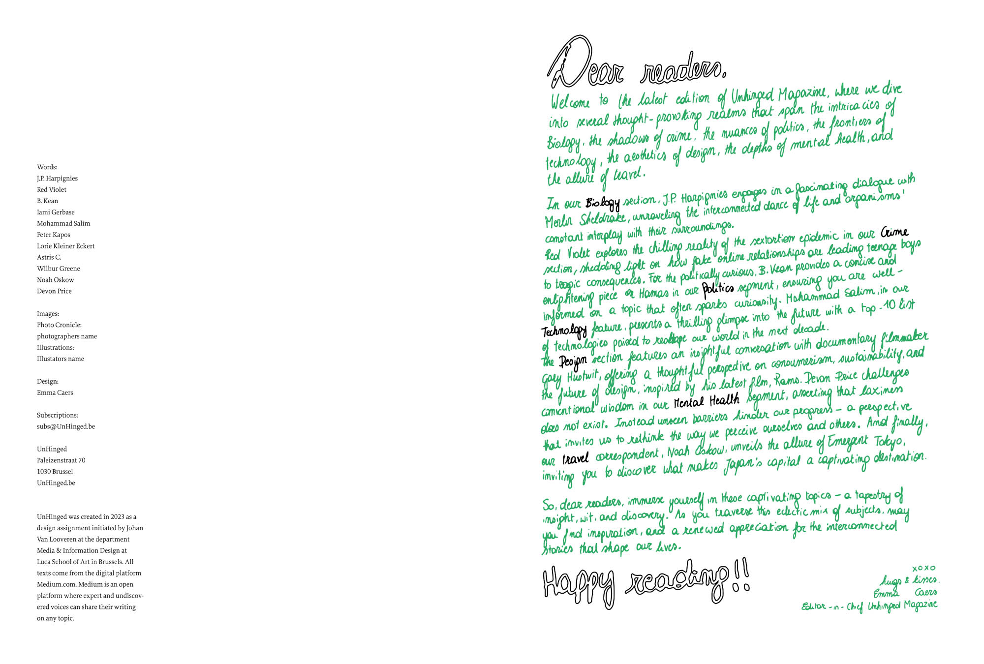 Unhinged Magazine was a fictitious publication, made to enhance my skills in editorial design. The content featured articles curated from recent months, from the platform Medium, while the layout was conceptualized and designed by me.